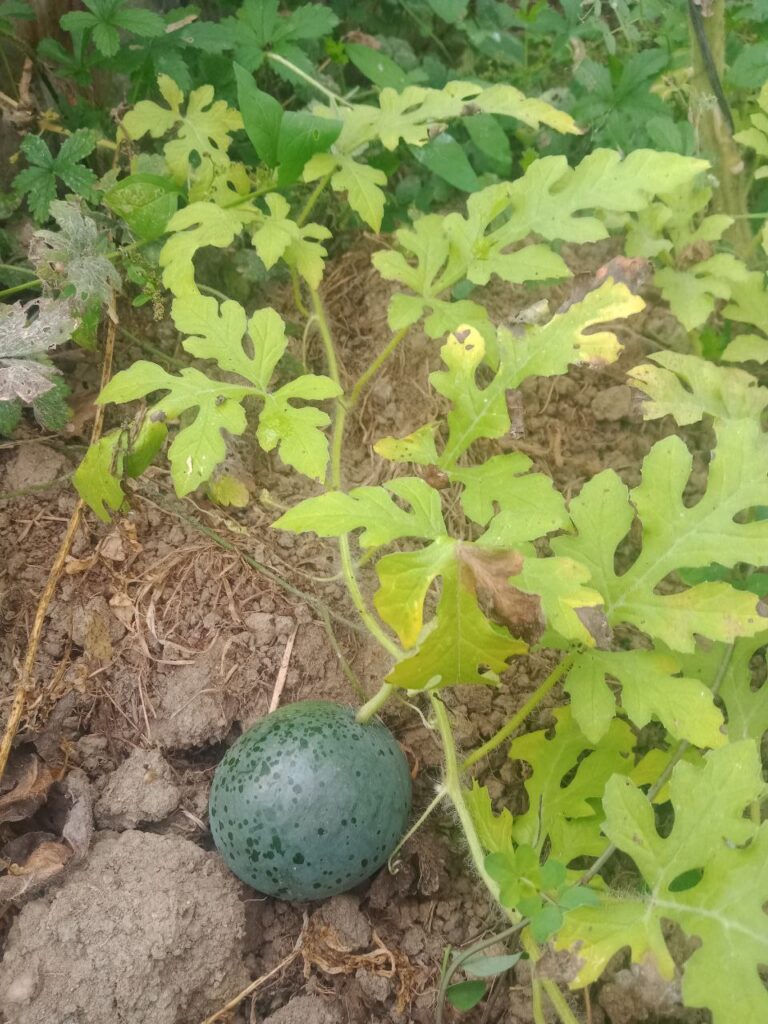 Y allí esta nuestra sandía gigante, mano a mano con el huerto 🙂