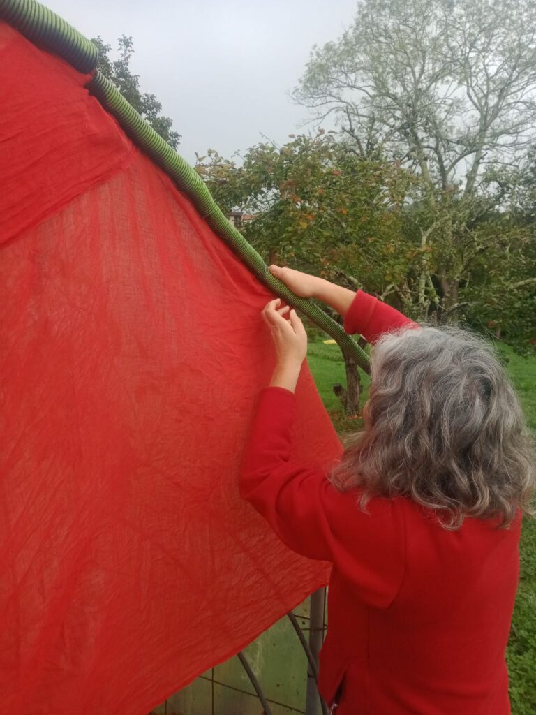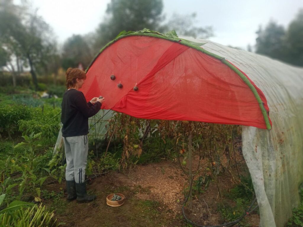 Y a la mañana del 5 de octubre, antes de ir a manifestar en la plaza l’Humedal, nos pusimos con la obra. Cortar consuelda, fijar tela y mini sandías…